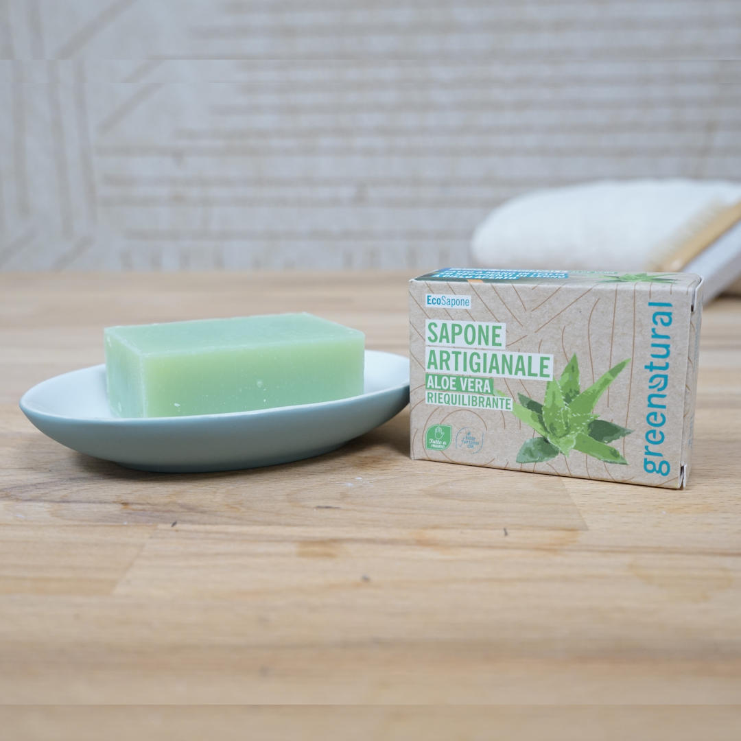 Greenatural’s open air Aloe eco-soap is handcrafted in Italy into a wooden mold through a cold process method.