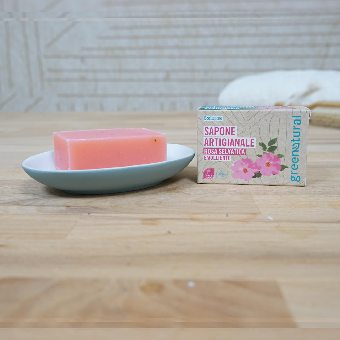 Greenatural’s open air Rose eco-soap is handcrafted in Italy into a wooden mold through a cold process method.