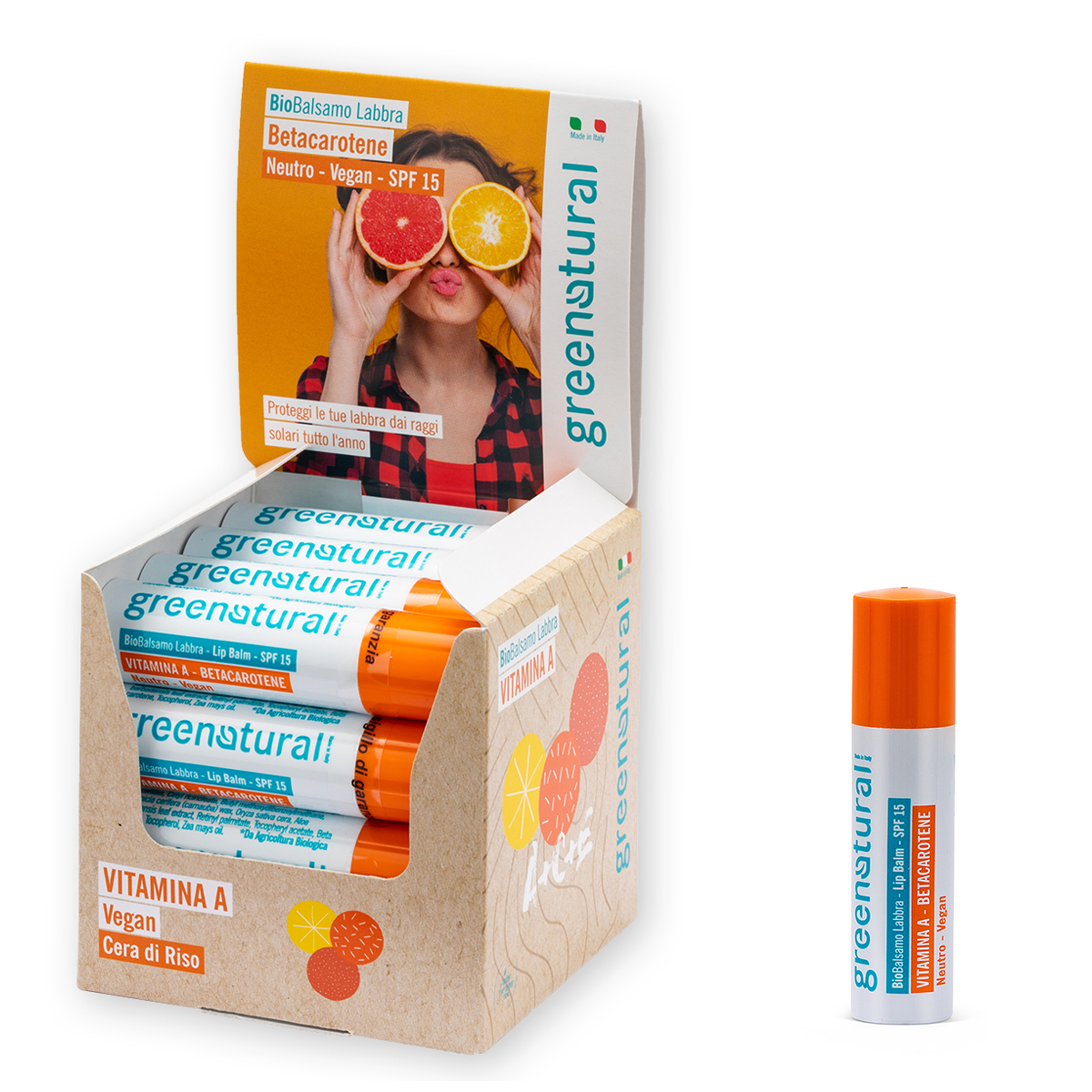 Vitamin A organic lip balm with SPF15 gives you the protection you are looking for! Its formula is rich in ingredients known for their protective and soothing properties. In particular beta-carotene and vitamin A, natural antioxidants that help to improve overall lip moisture.